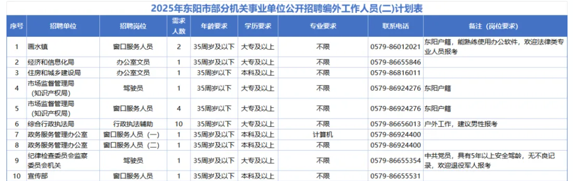 本次东阳市部分机关事业单位共计划招聘74名编外工作人员。具体招聘条件详见附件《2025年东阳市部分机关事业单位公开招聘编外工作人员(二)计划表》。