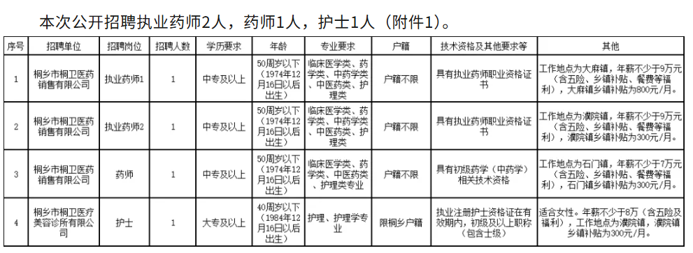 2.执业药师2岗位需中专及以上学历,临床医学类、药学类、中药学类、中医药类、护理类专业,50周岁以下(1974年12月16日以后出生),不限户籍,具有执业药师职业资格证书。工作地点为濮院镇,濮院镇乡镇补贴为300元/月。