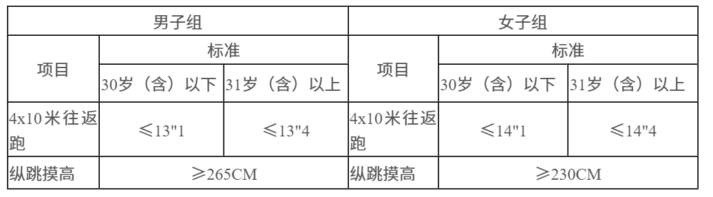 体能测试参照《公安机关录用人民警察体能测评项目和标准》开展,项目包括男/女4x10米往返跑和纵跳摸高两项。
