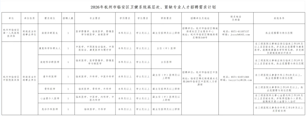 本次招聘由2家医疗卫生单位设置7个岗位,共招聘事业编制人员7名,各招聘单位、岗位、人数、条件、其他要求及咨询电话等详见《2026年杭州市临安区卫健系统高层次、紧缺专业人才招聘需求计划》(附件1)。