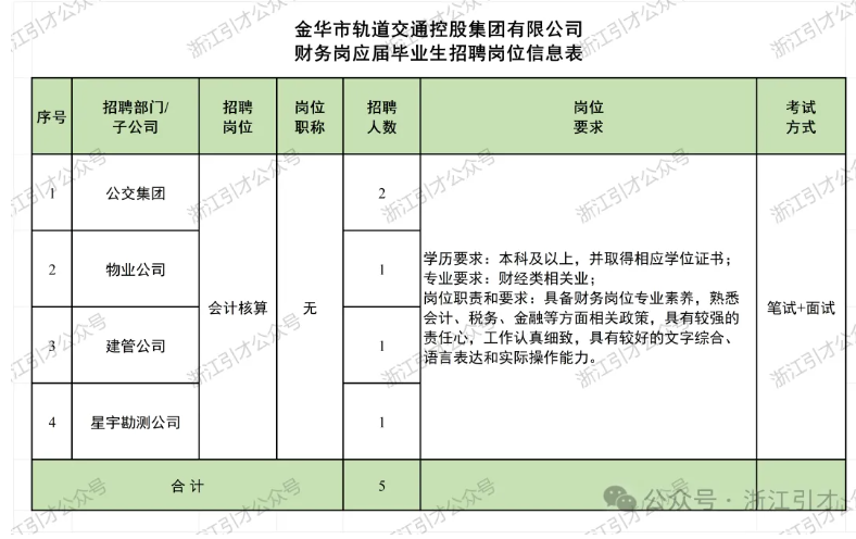 集团旗下设有金华市公交集团有限公司(以下简称公交集团)、金华市轨道交通控股集团物业管理服务有限公司(以下简称物业公司)、金华市轨道交通控股集团建设管理有限公司(以下简称建管公司)、金华市轨道交通控股集团星宇勘测技术有限公司(以下简称星宇勘测公司)等多家子公司。现因工作需要,拟公开招聘一定数量的财务岗应届毕业生。