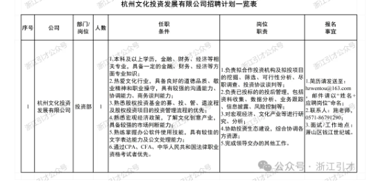招聘职位相关信息详见《杭州文化投资发展有限公司招聘计划一览表》。