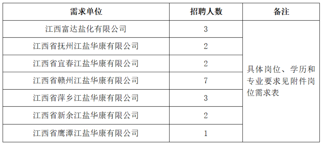 因工作需要,江盐集团盐品事业部所属单位面向校园、社会招聘20名员工,现将招聘事项公告如下。