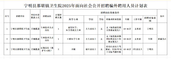 因工作需要,现面向社会公开招聘卫生专业技术人员2名,救护车司机2名,共4名人员。具体招聘信息如下: