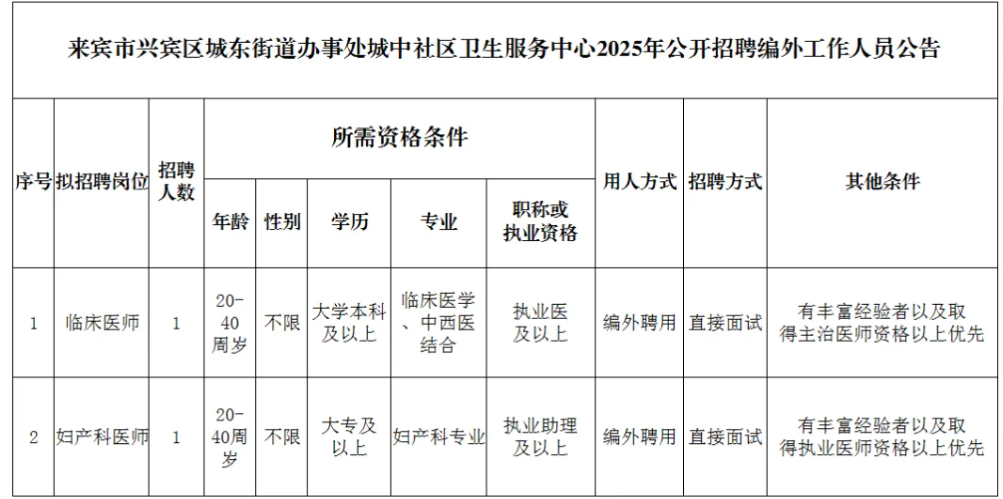 (一)现场报名:报名需要提交材料《来宾市兴宾区城东街道办事处城中社区卫生服务中心编外人员报名登记表》(见附件)、个人简历、身份证、毕业证、执业证、资格证原件及复印件。