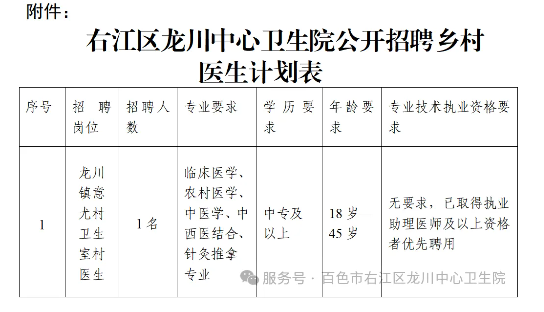 根据百色市右江区龙川镇乡村医疗卫生服务工作实际需要,百色市右江区龙川中心卫生院拟面向社会公开招聘乡村医生1名,具体事项公告如下: