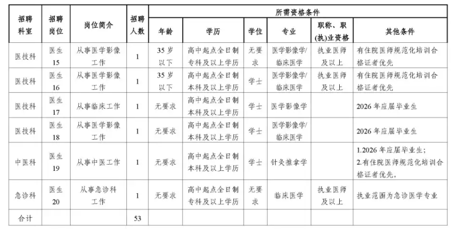 为满足医院发展对人才的需求,经研究,面向社会公开招聘53名编外工作人员。现将有关事项公告如下: