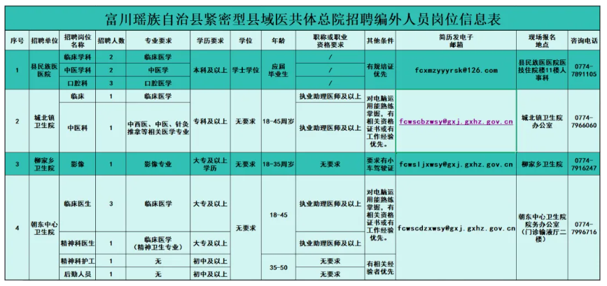 岗位具体要求如下:《富川瑶族自治县紧密型县域医共体总院招聘编外人员岗位信息表》。