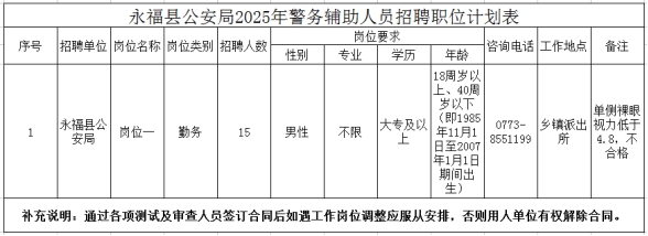 计划招聘警务辅助人员15名。具体岗位、招聘人数、资格条件详见《永福县公安局辅警招聘计划表》。