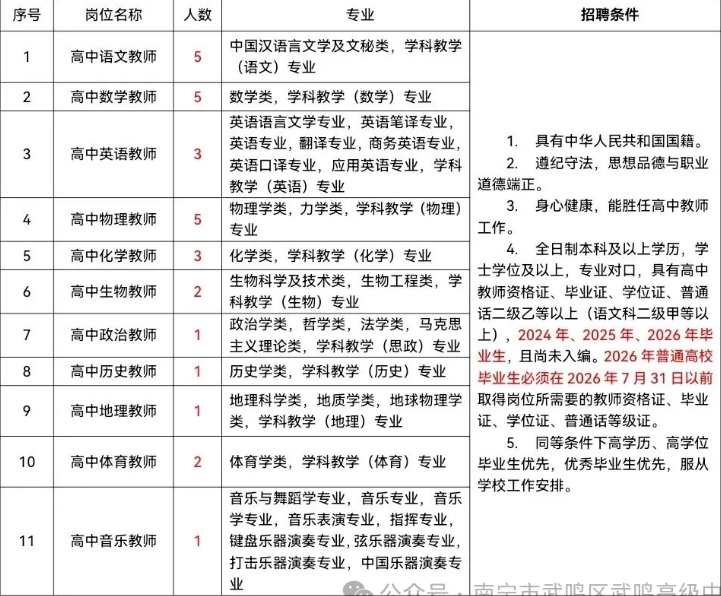 为解决南宁市武鸣区武鸣高级中学教师队伍人才紧缺问题,确保学校教育教学工作正常开展,按照公开、平等、竞争、择优的原则,我校使用实名编制公开招聘教师29名。现将有关事项公告如下:
