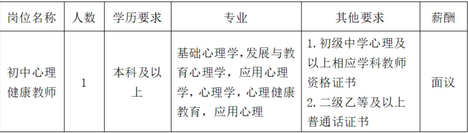 因工作需要,我校拟向社会公开招聘临聘初中心理健康教师1名,为确保此次招聘工作顺利完成,现将有关事项公告如下: