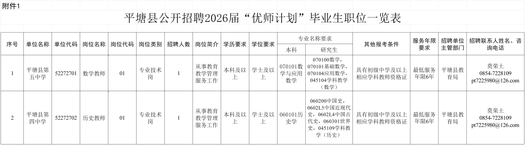 平塘县计划招聘2026届“优师计划”毕业生2名(初中数学、初中历史教师各1名)。