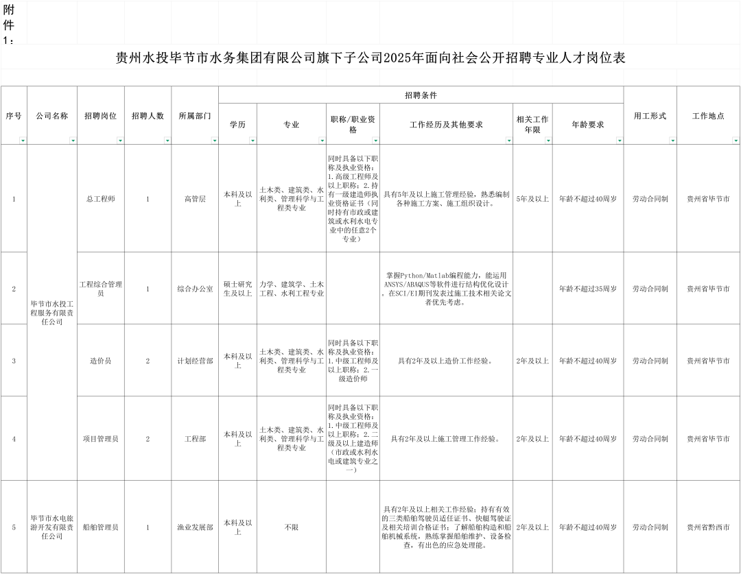 (二)毕节市水电旅游开发有限责任公司计划招聘1个岗位,共1名人员,具体为船舶管理员1名(具体岗位及要求详见附件1)。