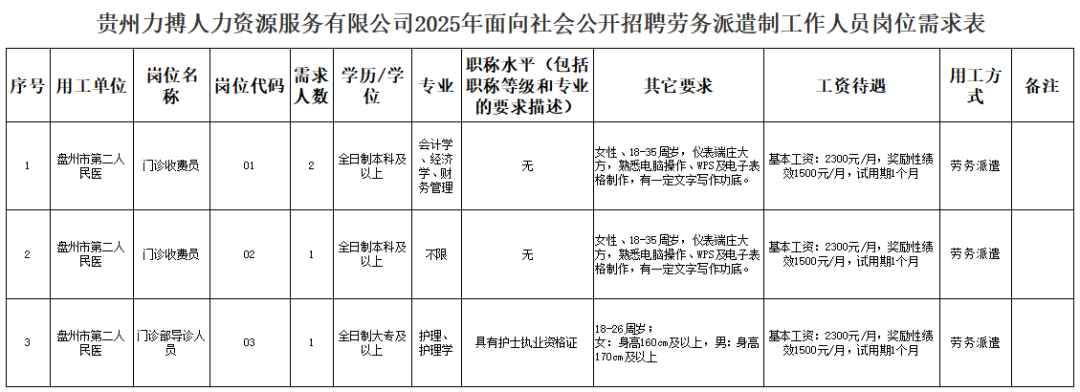 贵州力搏人力资源服务有限公司2025年面向社会公开招聘劳务派遣制工作人员4名,派遣至盘州市第二人民医院。具体招聘职位详见附件1《贵州力搏人力资源服务有限公司2025年面向社会公开招聘劳务派遣制工作人员岗位需求表》。