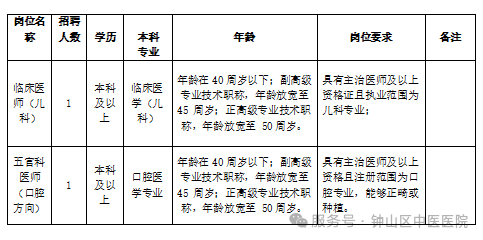 为进一步加强钟山区中医医院专业技术人才队伍建设,现面向社会公开招聘编制外医师2名,分别为临床主治医师(儿科)1名,五官科主治医师(口腔方向)1名,具体公告如下: