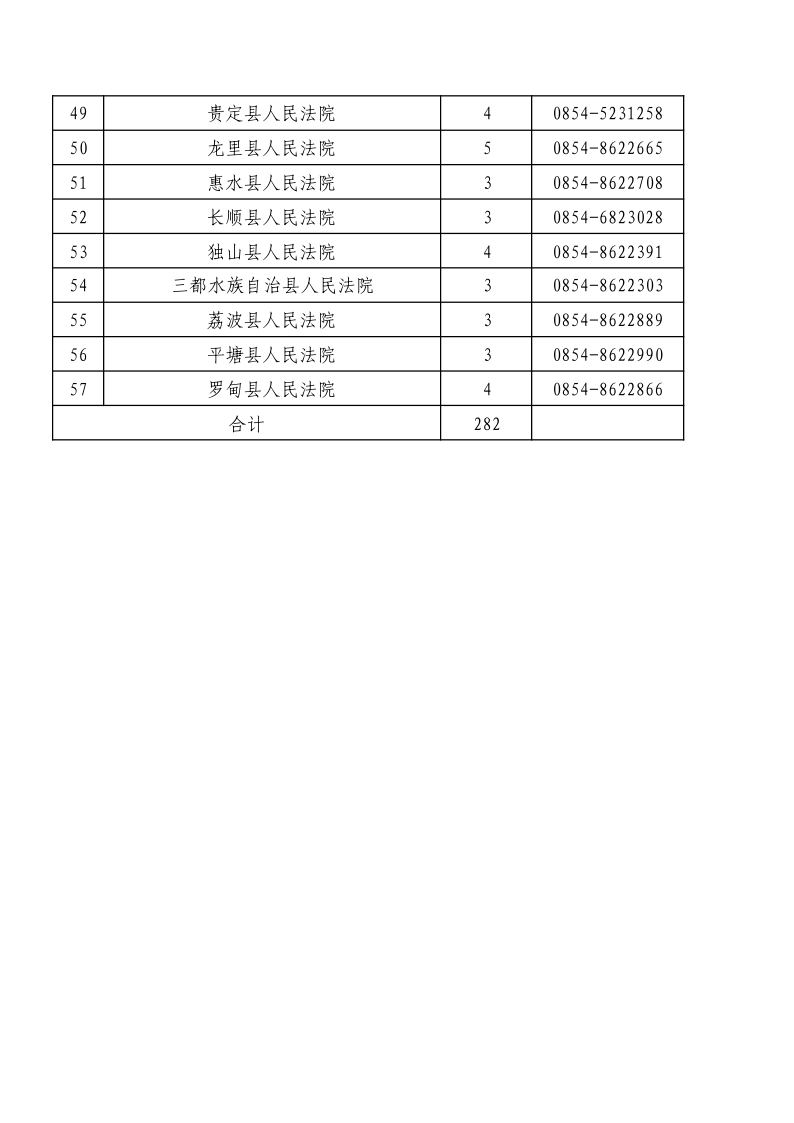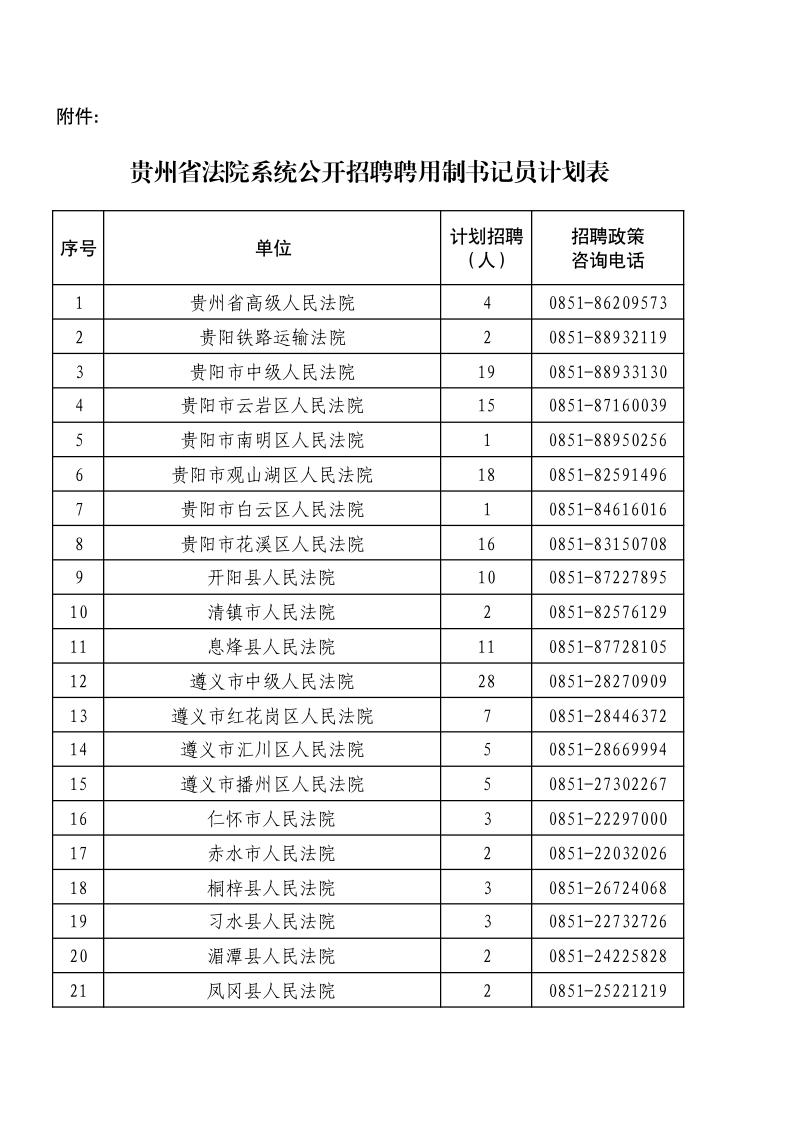 本次招聘计划共282名。其中,省法院4名、贵阳铁路运输法院2名、贵阳市两级法院93名、遵义市两级法院70名、安顺市两级法院33名、黔东南州两级法院37名、黔南州两级法院43名(详见附件)。