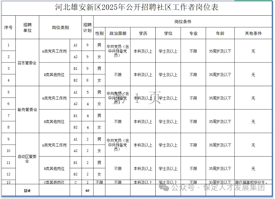 公开招聘社区工作者62名,详见附件《河北雄安新区2025年公开招聘社区工作者岗位表》。