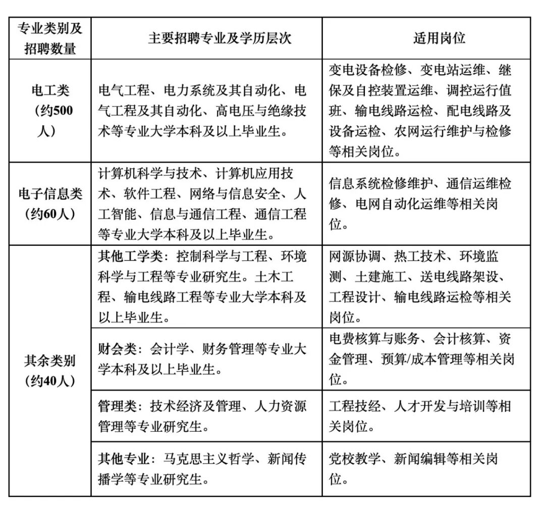 招聘专业类别为电工类、电子信息类、其他工学类、财会类、管理类及其他专业,招聘专业是指主修专业,不包含辅修专业。最终招聘数量将根据上级单位核定情况相应调整,第一批招聘数量(含提前批校园招聘数量)暂定如下: