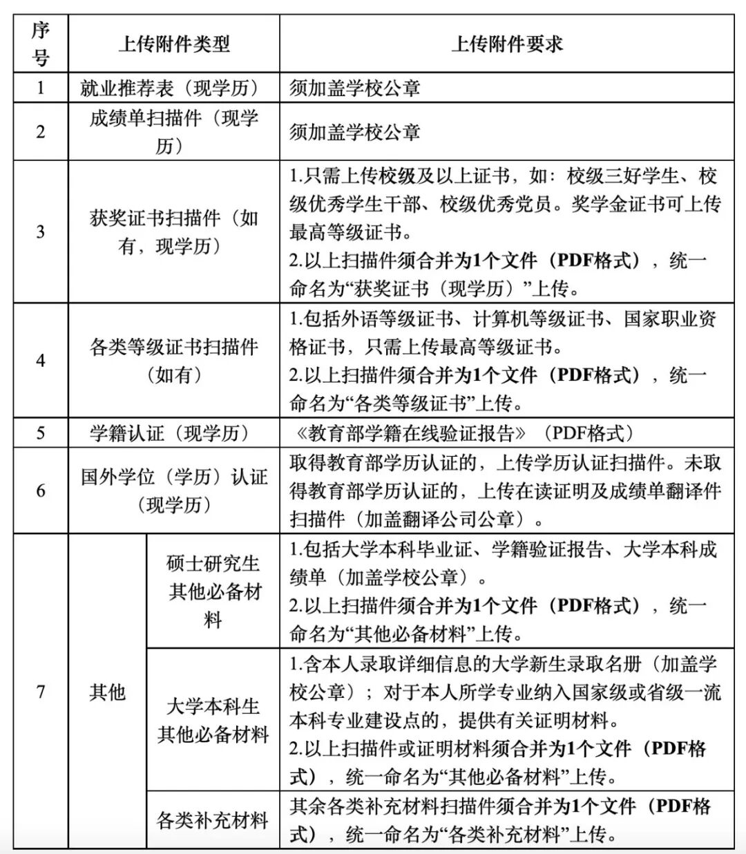 3.上传应聘附件材料。应聘毕业生须通过招聘平台及时、规范上传个人应聘附件材料,应聘附件材料文档数量一般不超过7个。未按要求上传必需材料且影响简历筛选判断或材料真实性存疑的,将影响简历筛选结果。上传附件具体要求如下: