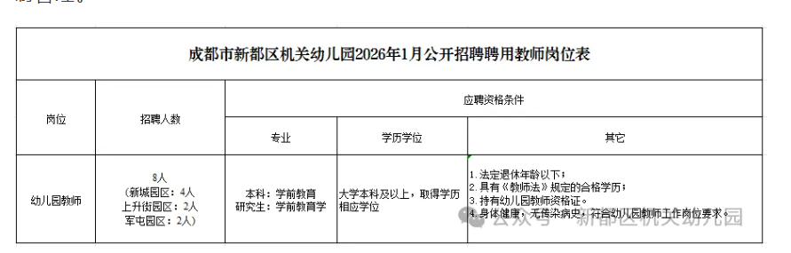 附件1:2026年新都区机关幼儿园面向社会公开招聘聘用教师岗位表