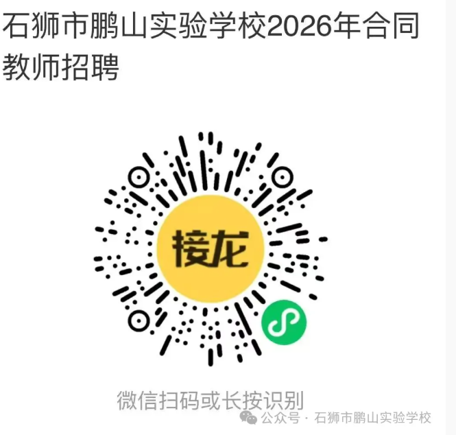有意向者请扫描下方“石狮市鹏山实验学校2026年合同教师招聘”二维码进入,如实填写个人相关信息,并将应聘资料(如个人简历、身份证、学历学位证书、教师资格证书、普通话证书、职称证书、骨干教师证书、获奖证书等)电子文档或拍照图片打包发至邮箱:pssybgs@163.com,邮件名称命名为:学段+学科+姓名。