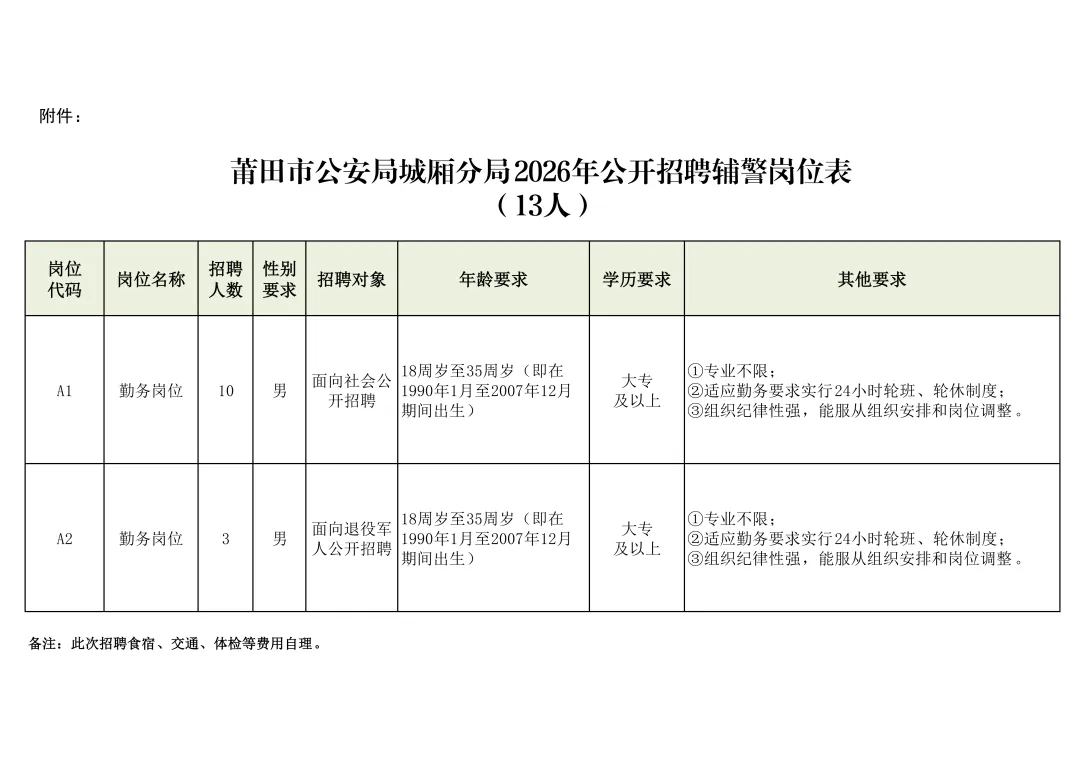 莆田市公安局城厢分局辅警13名,具体职位、人数、条件等见《莆田市公安局城厢分局2026年公开招聘辅警岗位表》(附件1)。
