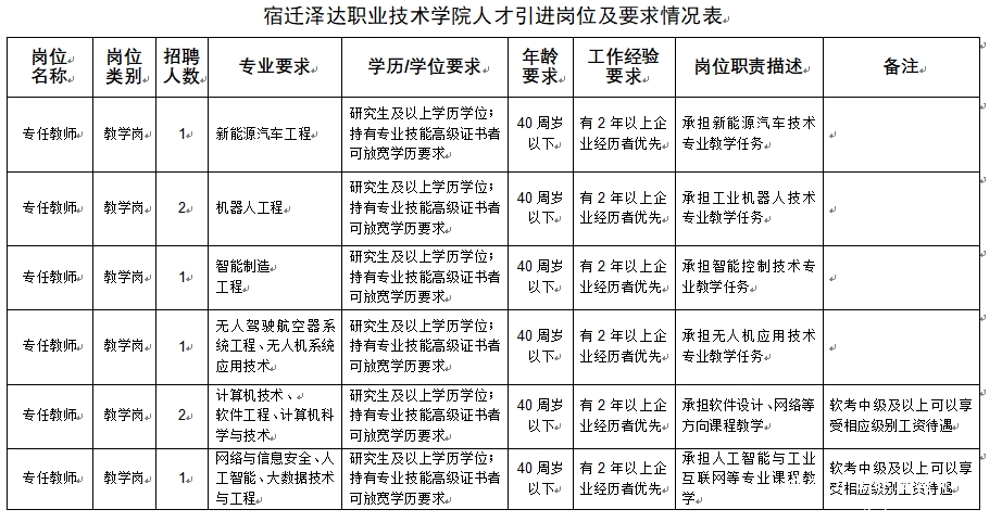 宿迁泽达职业技术学院人才引进岗位及要求情况表