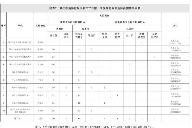 为满足肇庆市社会经济发展对消防救援力量的需求,进一步加强肇庆市消防救援队伍的建设,优化消防救援力量配置,根据《肇庆市消防救援支队政府专职消防员招录工作实施办法(试行)》文件要求,现面向社会公开招聘205名政府专职消防员,具体公告如下: