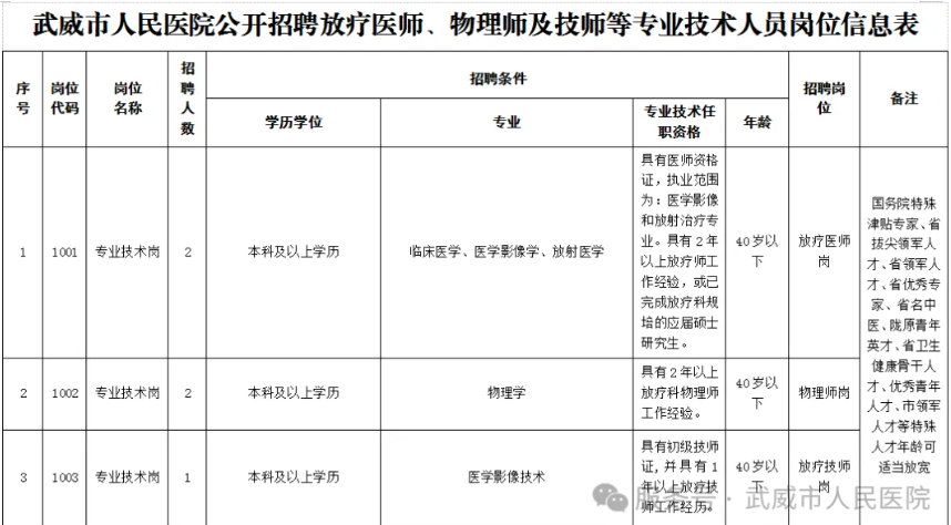 详见《武威市人民医院公开招聘放疗医师、物理师及技师等专业技术人员岗位信息表》