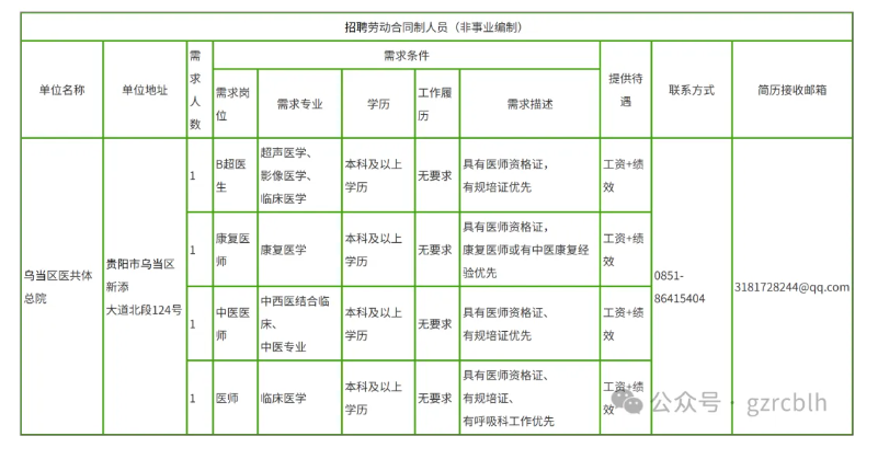 贵阳市乌当区医共体总院是乌当区唯一的一家公立非营利性二级甲等综合医院、爱婴医院,是乌当区人民医院、区妇幼保健院与区中医医院、5家社区卫生服务中心、8家乡镇卫生院共同组建的“紧密型县域医疗共同体”。为进一步加大医院学科建设,着力优化人才队伍结构,全面提升医疗服务救治能力,更好满足广大群众就医需求。经研究,决定面向社会招聘4名非编制人员。