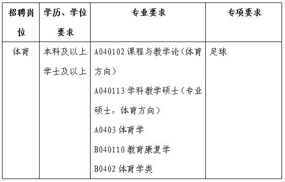 体育外聘教师1人(足球专项)。