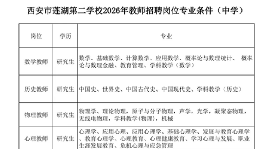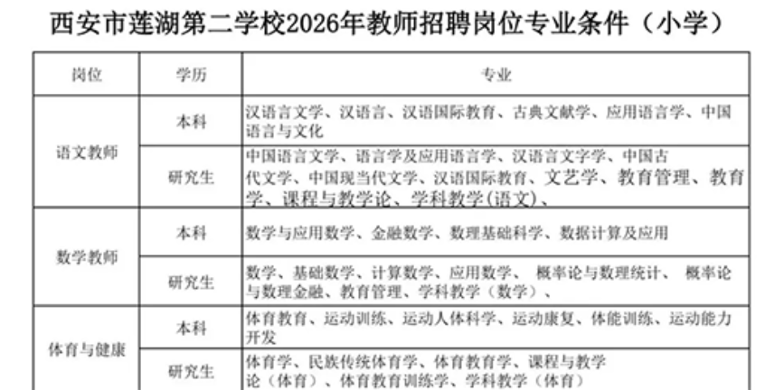 3.应聘初中教师应具备研究生及以上学历和相应学位,应聘小学教师应具备大学本科及以上学历和相应学位。(详见西安市莲湖第二学校2026年教师招聘岗位条件(小学)/(中学))
