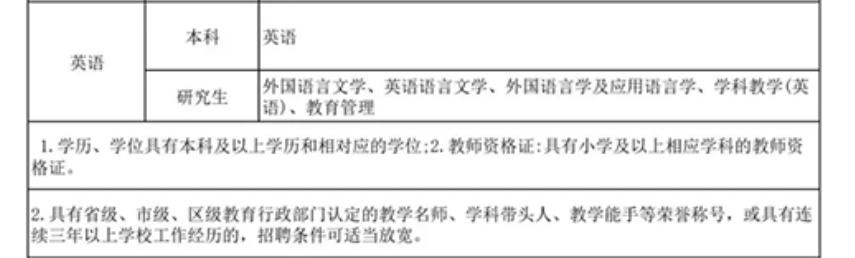 6.具有省级、市级、区级教育行政部门认定的教学名师、学科带头人、教学能手等荣誉称号,或具有连续三年以上学校工作经历的,应聘小学、初中教师岗位的年龄可放宽至40周岁,应聘小学教师岗位的学历、学位最低为本科及相应学位,应聘初中教师岗位的学历、学位可放宽至本科及相应学位