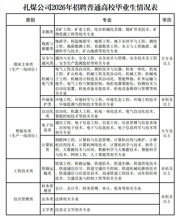 根据华能扎赉诺尔煤业有限责任公司(以下简称“扎煤公司”)发展需要,现将2026年招聘全日制普通高校统招应届毕业生有关事项公告如下: