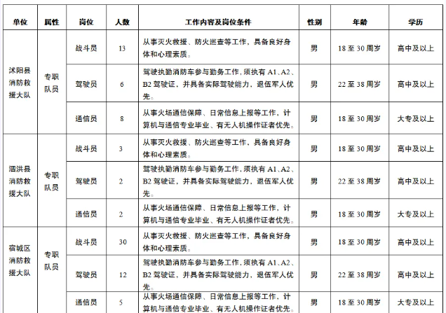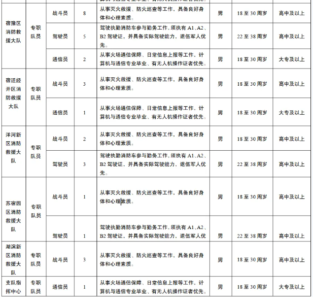 为满足社会发展对消防救援力量的需求,根据宿迁市各县(市、区)灭火救援工作实际需要,现面向社会公开招聘111名专职消防队员(编外),具体公告如下: