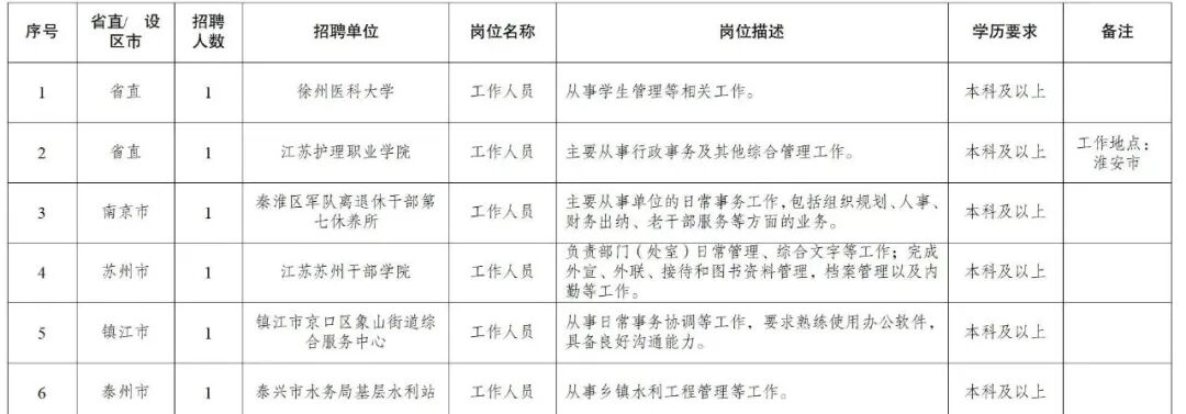 江苏省提供6个事业单位招聘岗位(岗位信息详见附件1),每个岗位招聘1人。