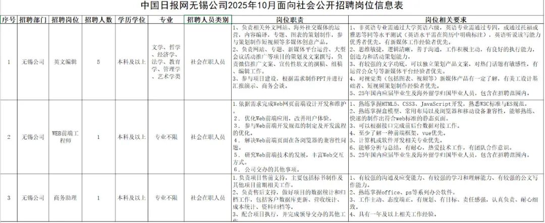 根据工作需要和有关规定,中国日报网无锡公司2025年10月拟公开招聘无锡公司3个工作岗位共7名人员,具体事项如下。