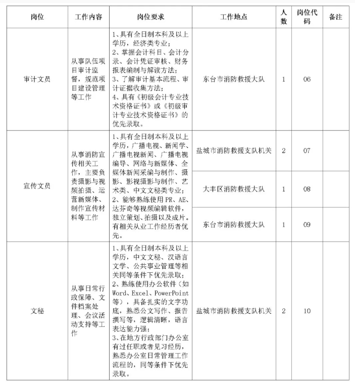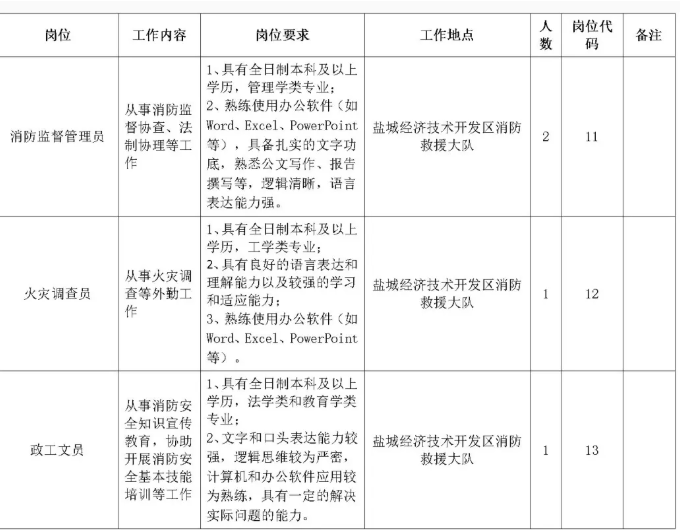 为加强盐城市消防救援支队灭火防火和应急救援力量建设,根据工作需要,现面向社会公开招聘消防文员,具体招聘事宜公告如下: