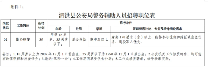 因工作需要,泗洪县公安局面向社会公开招聘警务辅助人员39名。根据《江苏省公安机关警务辅助人员管理条例》《全县公安机关警务辅助人员管理考核实施细则(修订)》相关规定,制定本简章。