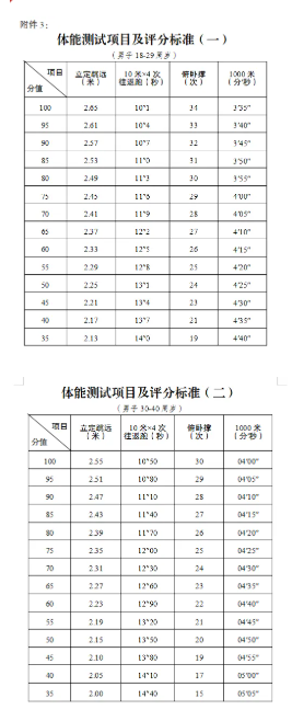 (三)体能测试。此次招聘的人员均需要参加体能测试,项目为:4×10米跑、俯卧撑、立定跳远、1000米。测试标准按照“体能测试项目及评分标准”(详见附件3和附件4)执行,体能测试各小项单项100分,各项平均分折算后计入体测总成绩。非因伤病原因,任一单项弃权者无体测总成绩。