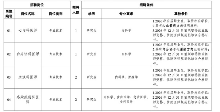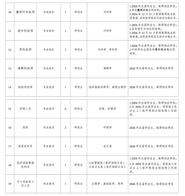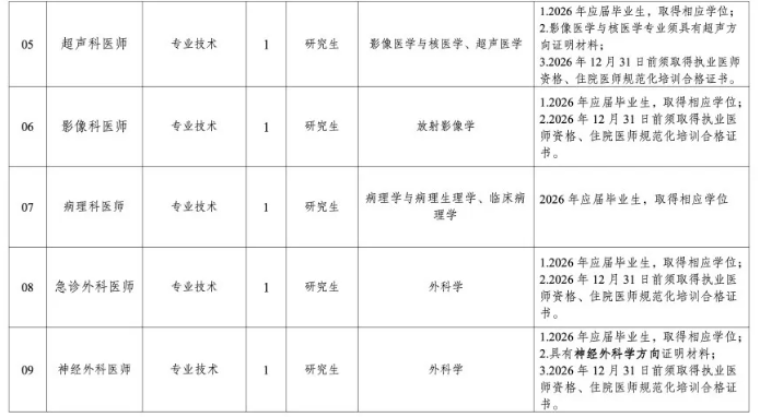 5.应聘人员为2026年普通高校应届毕业生,2024年、2025年毕业但尚未就业人员视同2026年应届毕业生;部分招收非应届生的岗位,要求具备2年以上三级甲等综合性医院工作经历。