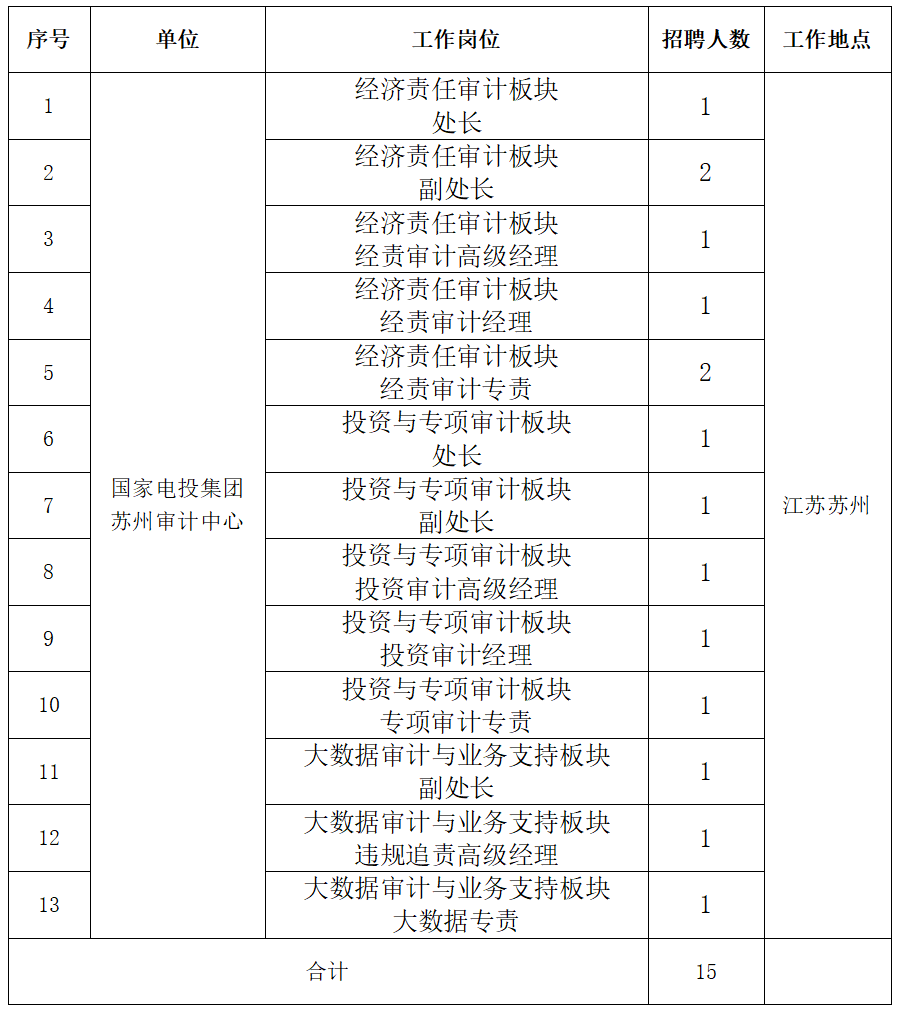 根据工作需要,现面向国家电投集团系统内公开选聘国家电投集团苏州审计中心13个岗位、共计15人,具体事项公告如下: