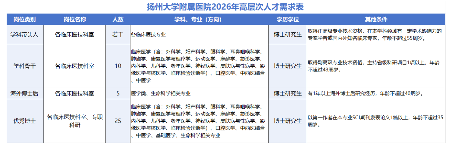为更好地推动医院高质量发展,早日建成特色鲜明、区域知名的高水平研究型大学附属医院,扬州大学附属医院现面向社会诚聘英才,并提供良好的工作条件、优厚的薪酬待遇和有力的支持保障。热诚欢迎海内外各类优秀人才的加盟,携手共创伟业!