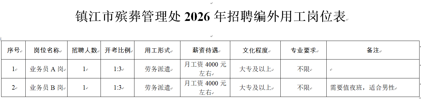 根据《镇江市市级机关事业单位编外用工管理办法》文件精神,结合本单位编外用工空缺和工作需要,市民政局下辖镇江市殡葬管理处决定招聘业务员岗位编外用工2名。