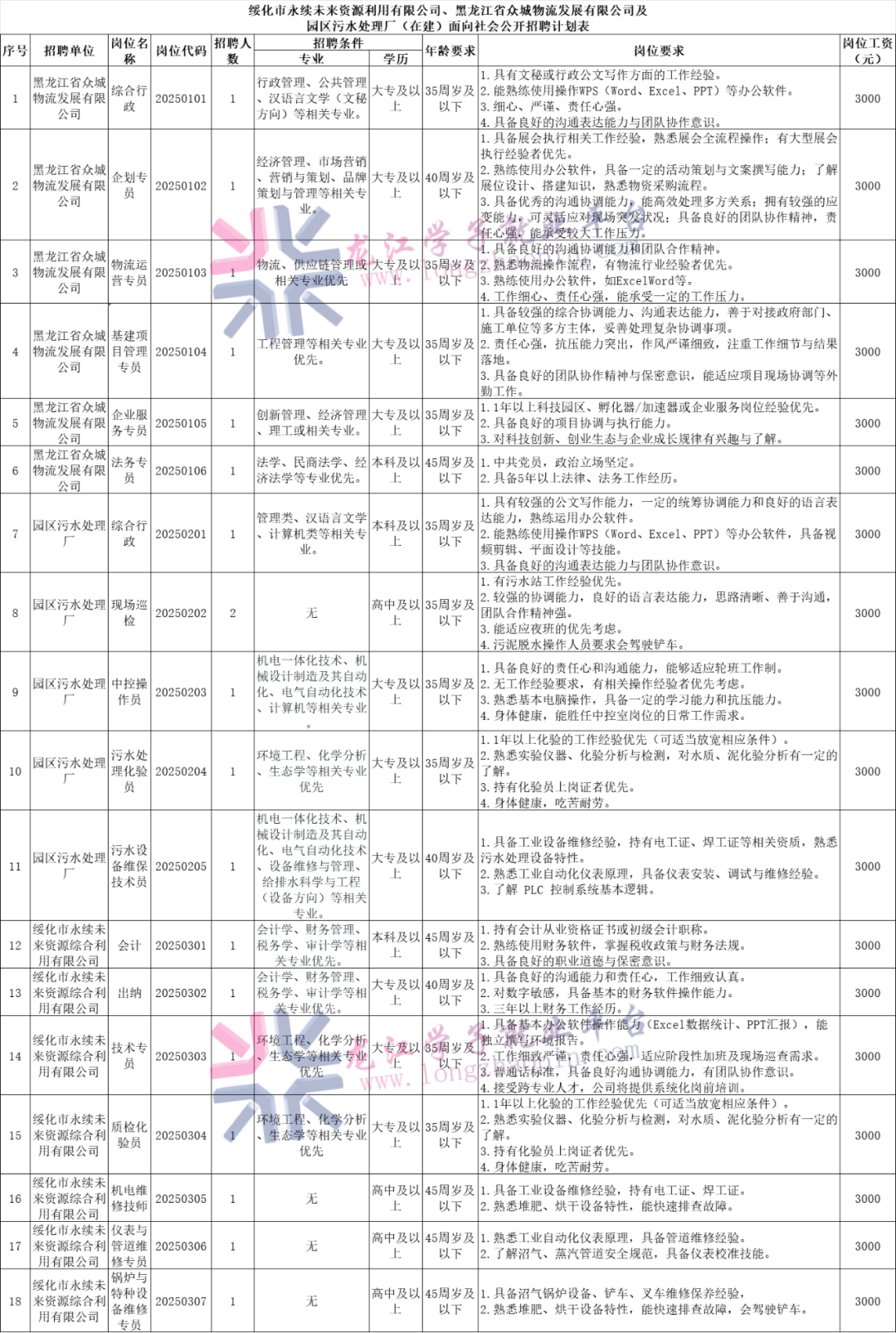 具体职位详见“附件1”《绥化市永续未来资源利用有限公司、黑龙江省众城物流发展有限公司及园区污水处理厂(在建)面向社会公开招聘计划表》(以下简称《招聘计划表》)。