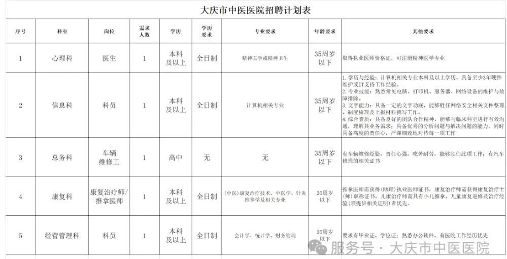 因工作需要,现大庆市中医医院拟招聘工作人员,具体要求如下: