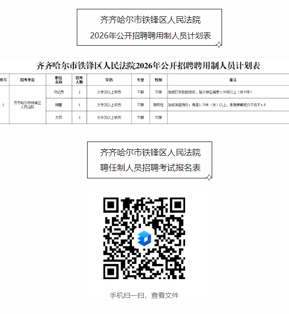 拟招聘聘用制书记员2名、聘用制辅警1名、聘用文员3名(详见下方《齐齐哈尔市铁锋区人民法院2026年公开招聘聘用制人员计划表》)。