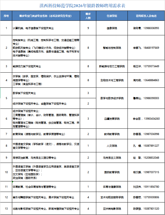 岗位需求如下图所示,详见《滇西科技师范学院2026年银龄教师聘用需求表》(附件1)。