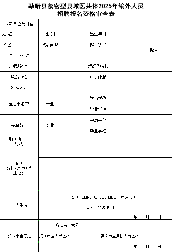 (1)《勐腊县紧密型县域医共体2025年公开招聘编外人员报名资格审查表》(贴小一寸近期标准证件照1张);