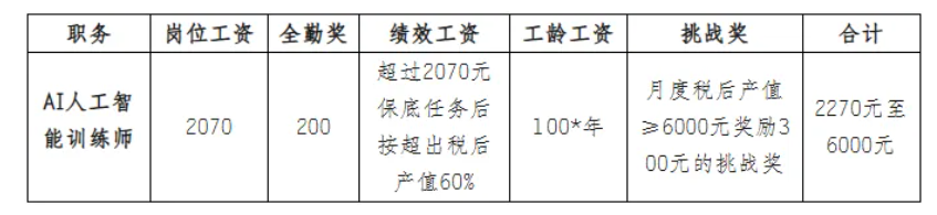 综合薪资:2270元—6000元,基本薪资2070元+全勤工资200元+绩效工资(超过2070元保底任务后按超出税后产值的60%计提)+工龄工资100元/年+月度挑战奖300元,转正后签订正式劳动合同,购买社保。